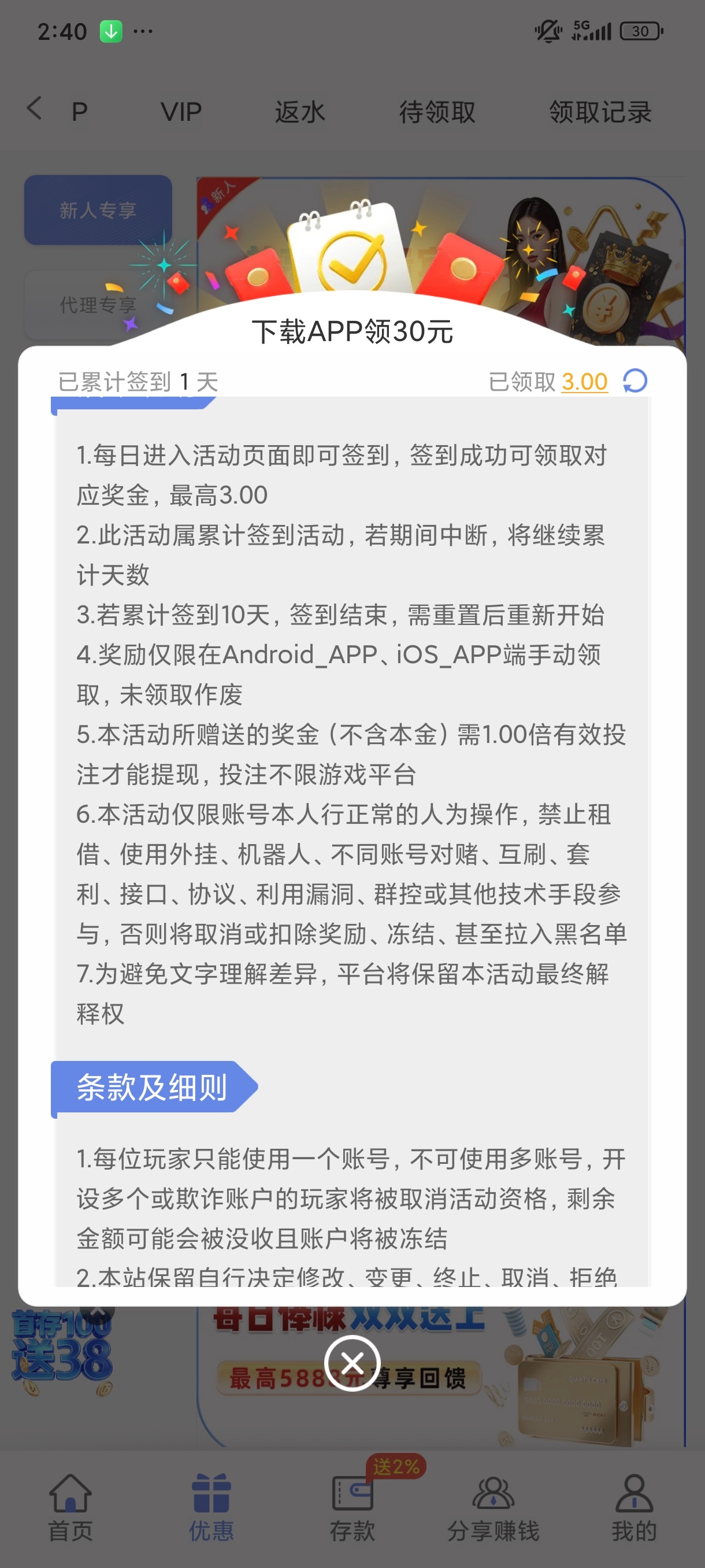 无需充值,下载app签到每天送3块连续10天,蚊子再小也是肉,论坛这么多人总会有赌神