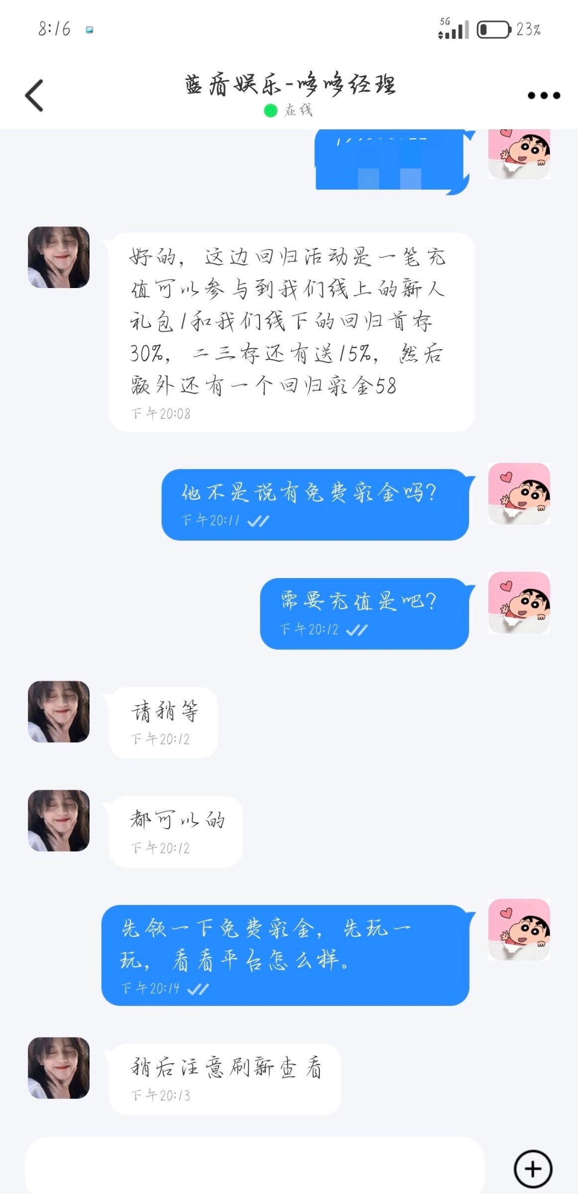 1分钱没充值,有号的漏接电话的去碰瓷吧。网址5092.com 优惠那里下载聊天软件,自动加客服说电话彩金