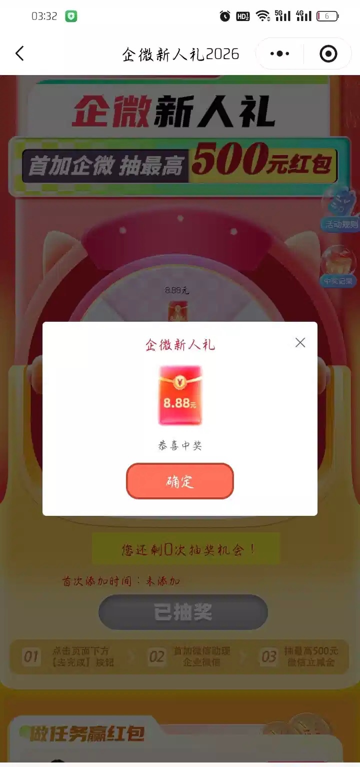 有中信银行卡的去首次添加企业微信抽立减金,没玩过的可以去试试,最低都能抽中1.88~500我只抽中了8.88